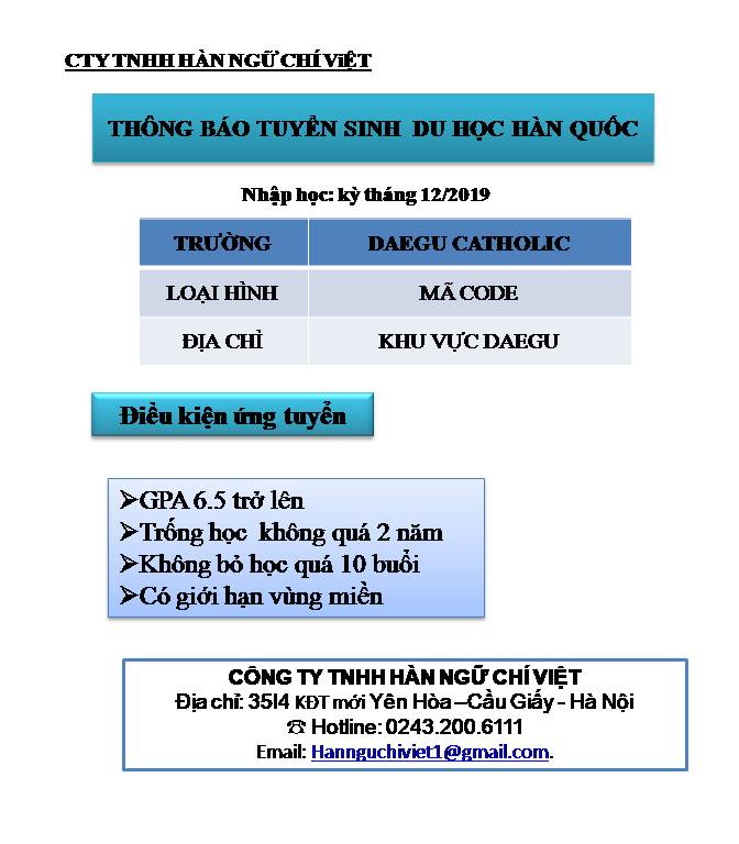 ⭕️ĐẠI HỌC DAEGU CATHOLIC: 100 CHỈ TIÊU CHO - TRƯỜNG MÃ CODE BAY KỲ THÁNG 12/2019