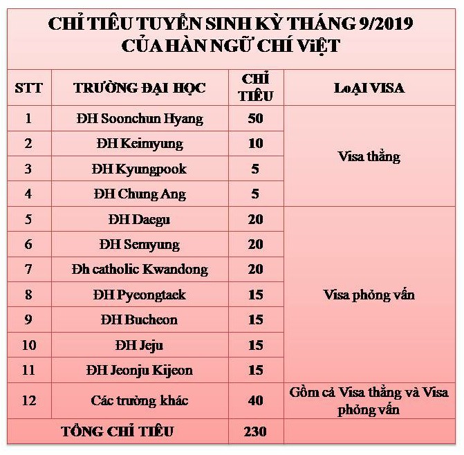 HÀN NGỮ CHÍ VIỆT CÔNG BỐ CHỈ TIÊU TUYỂN SINH DU HỌC HÀN QUỐC KỲ THÁNG 9/2019