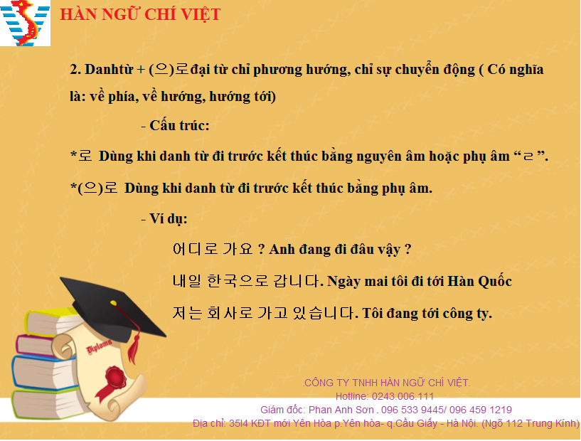 2.Danhtừ + (으)로: đại từ chỉ phương hướng, chỉ sự chuyển động ( Có nghĩa là: về phía, về hướng, hướng tới)